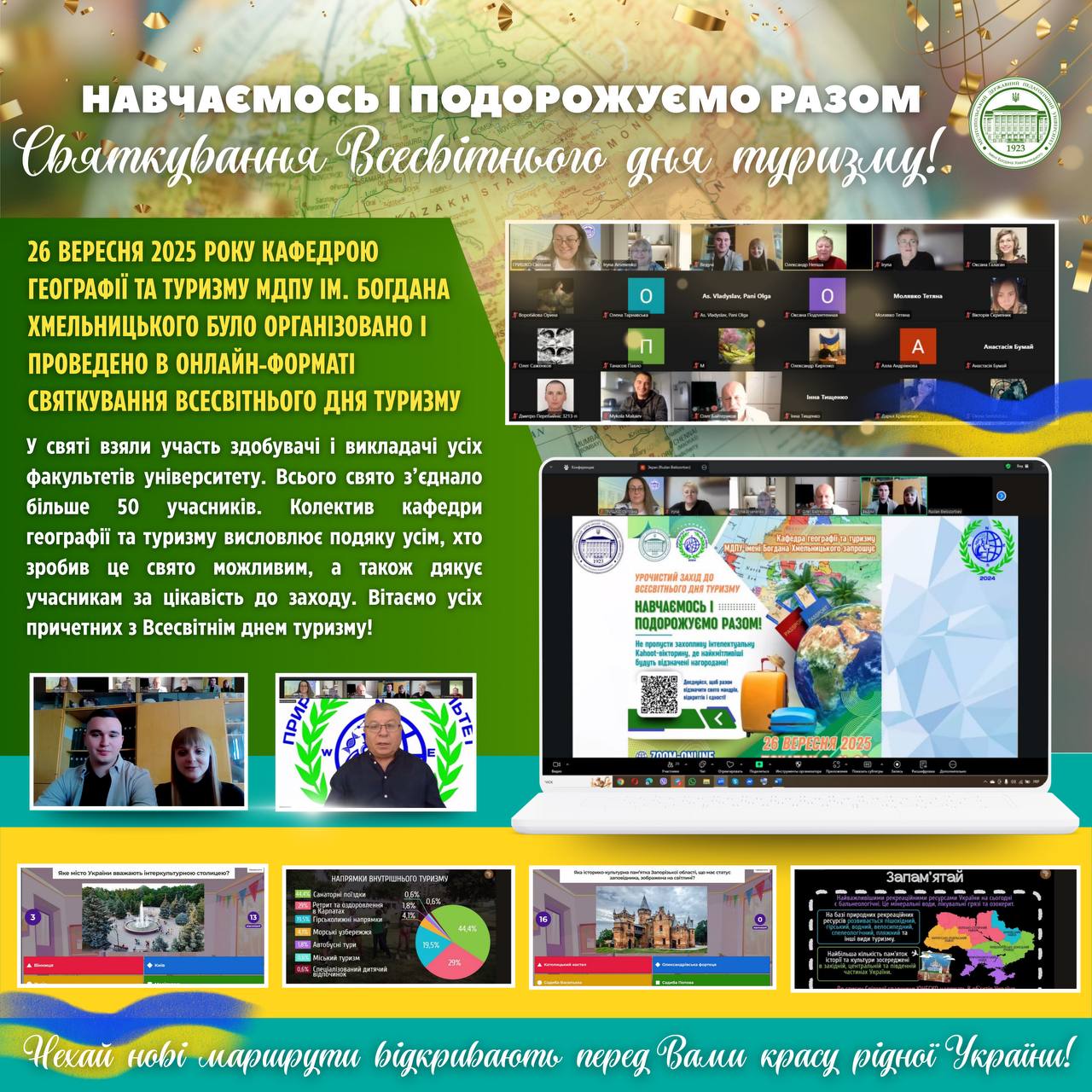 🎓🥳26 вересня 2025 року кафедрою географії та туризму Мелітопольського державного педагогічного університету імені Богдана Хмельницького було організовано і проведено в онлайн-форматі святкування Всесвітнього дня туризму.