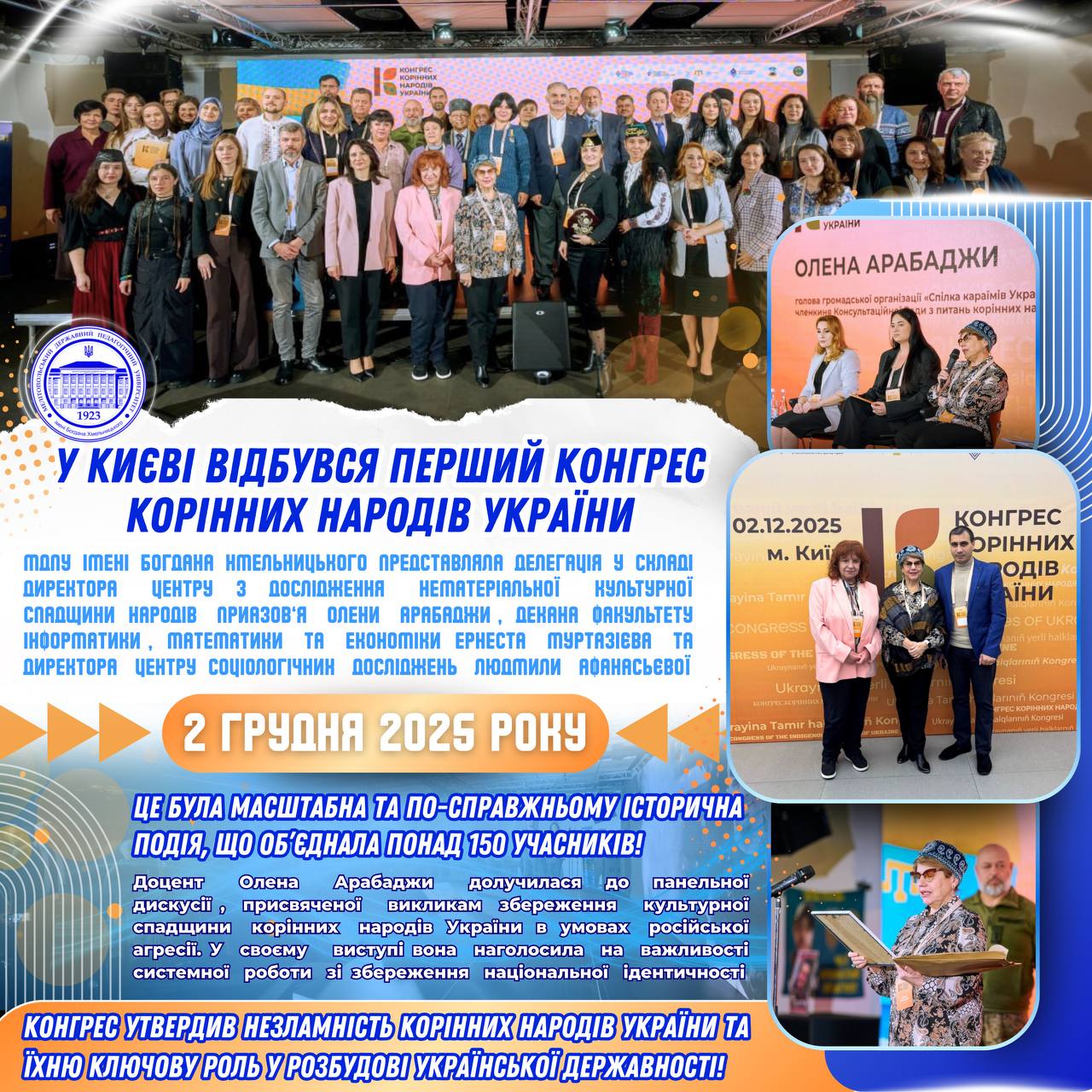 🎓⭐️У Конгресі взяла участь делегація МДПУ імені Богдана Хмельницького, до складу якої увійшли директор Центру з дослідження нематеріальної культурної спадщини народів Приазов’я Олена Арабаджи, декан факультету інформатики, математики та економіки Ернест Муртазієв та директор Центру соціологічних досліджень Людмила Афанасьєва.