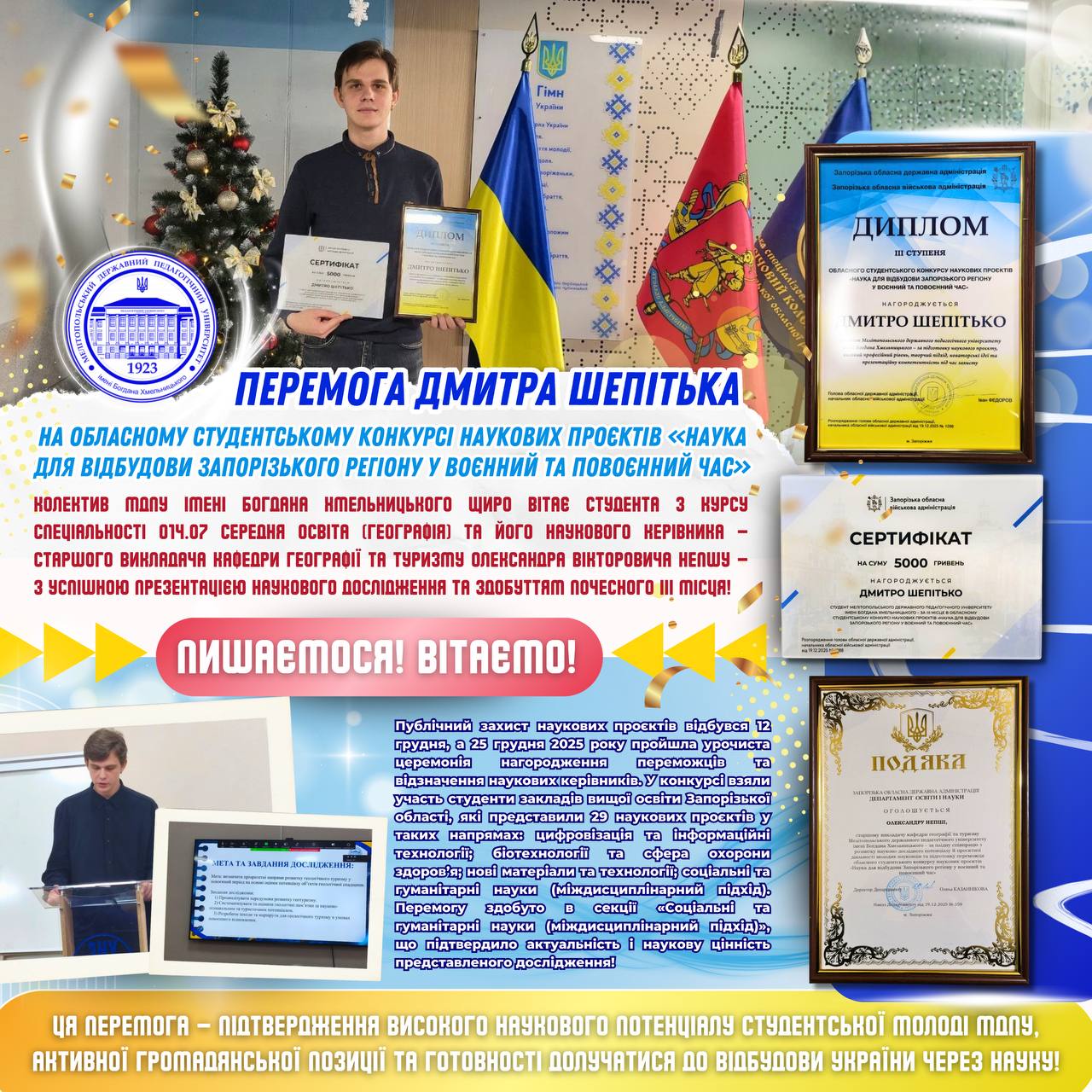 🥳‼️Особливо приємно відзначити, що серед переможців конкурсу — здобувач Мелітопольського державного педагогічного університету імені Богдана Хмельницького: ⭐️🎓 ШЕПІТЬКО ДМИТРО СЕРГІЙОВИЧ, студент 3 курсу спеціальності 014.07 Середня освіта (Географія),