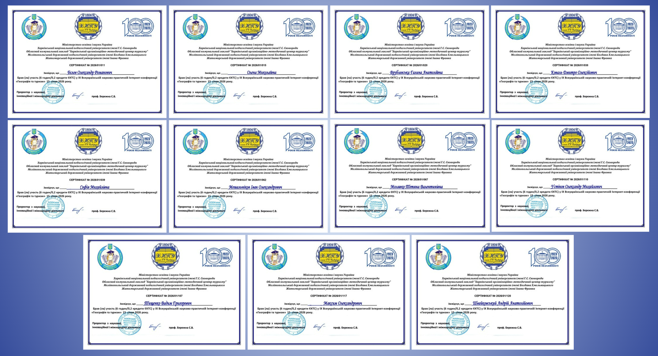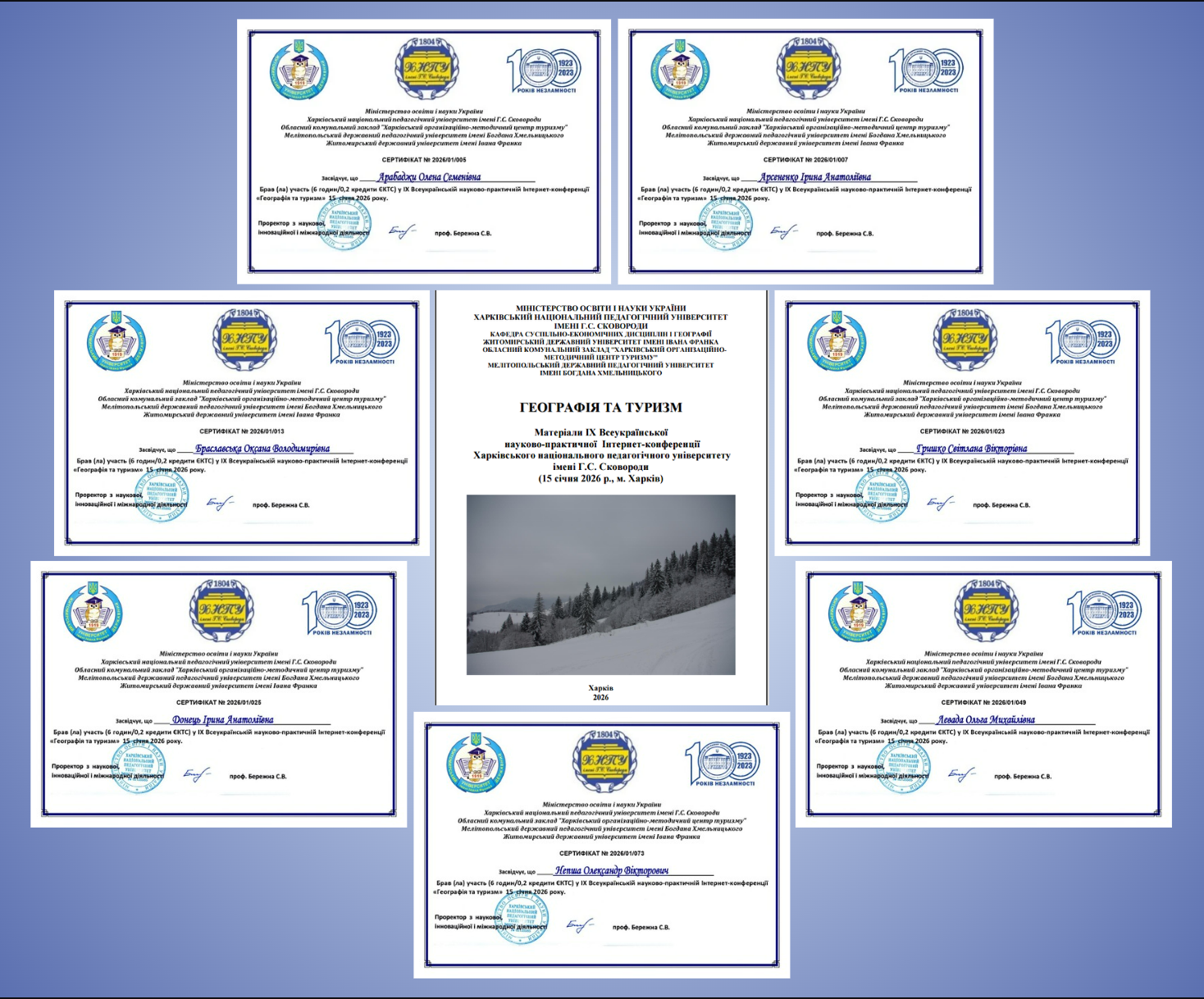 15 січня 2026 року науково-педагогічні працівники кафедри географії та туризму – професорка Оксана Браславська, доценти Олена Арабаджи, Ірина Арсененко, Світлана Гришко, Ірина Донець, Ольга Левада, старший викладач Олександр Непша, а також члени студентського наукового гуртка «Всесвіт» гідно представили наш заклад на ІХ Всеукраїнській науково-практичній інтернет-конференції «Географія та туризм».