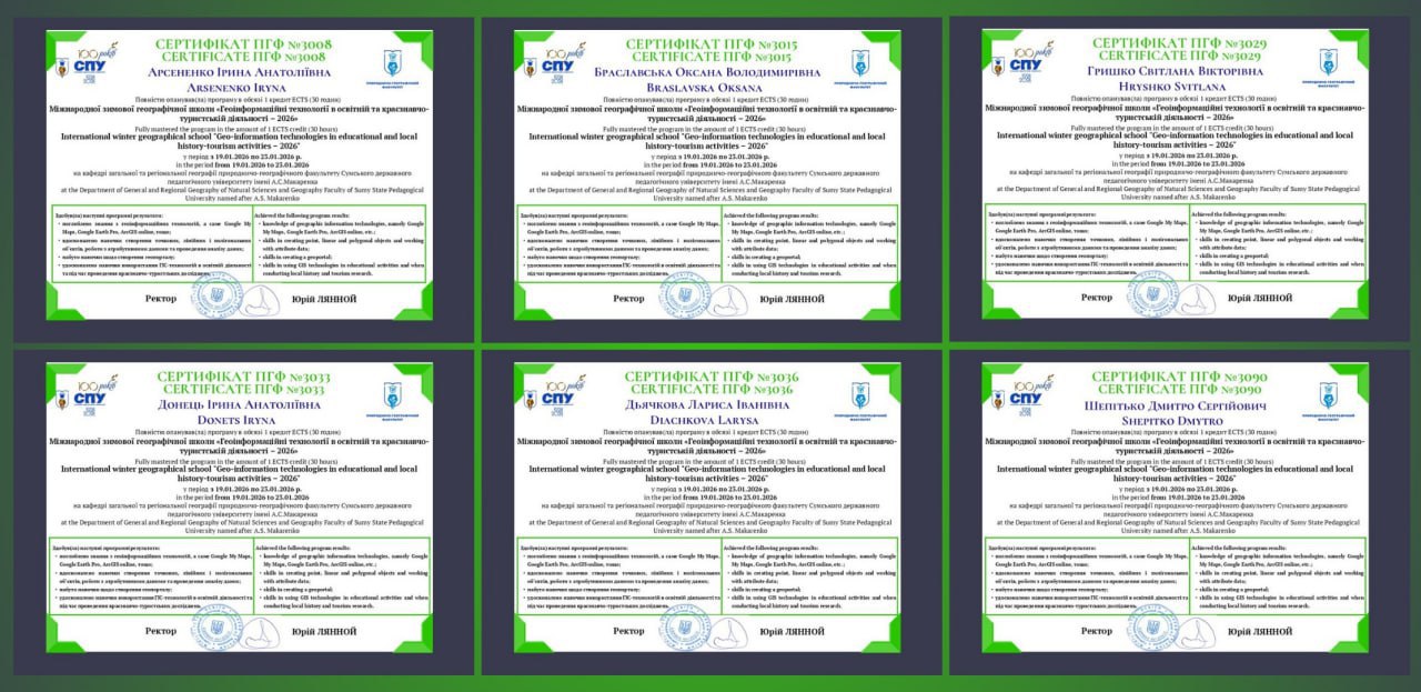 З 19 по 23 січня 2026 року професор Оксана Браславська, доценти Ірина Арсененко, Світлана Гришко, Ірина Донець кафедри географії та туризму, а також здобувачі спеціальності 014.07 Середня освіта (Географія), члени студентського наукового гуртка «Всесвіт» Лариса Дьячкова (312-п) та Дмитро Шепітько (313-п) дистанційно відвідали науково-практичний семінар «Міжнародна зимова географічна школа «Геоінформаційні технології в освітній та краєзнавчо-туристській діяльності – 2026» на базі Сумського державного педагогічного університету імені А.С. Макаренка.
