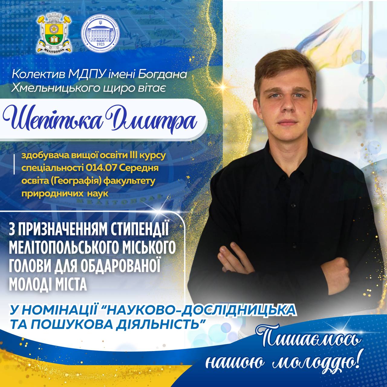 📚⭐️ Колектив Мелітопольського державного педагогічного університету імені Богдана Хмельницького щиро вітає ШЕПІТЬКА ДМИТРА СЕРГІЙОВИЧА, здобувача вищої освіти 3 курсу спеціальності 014.07 «Середня освіта (Географія)» факультету природничих наук, ‼️💐 із призначенням стипендії Мелітопольського міського голови для обдарованої молоді міста у номінації «Науково-дослідницька та пошукова діяльність»!