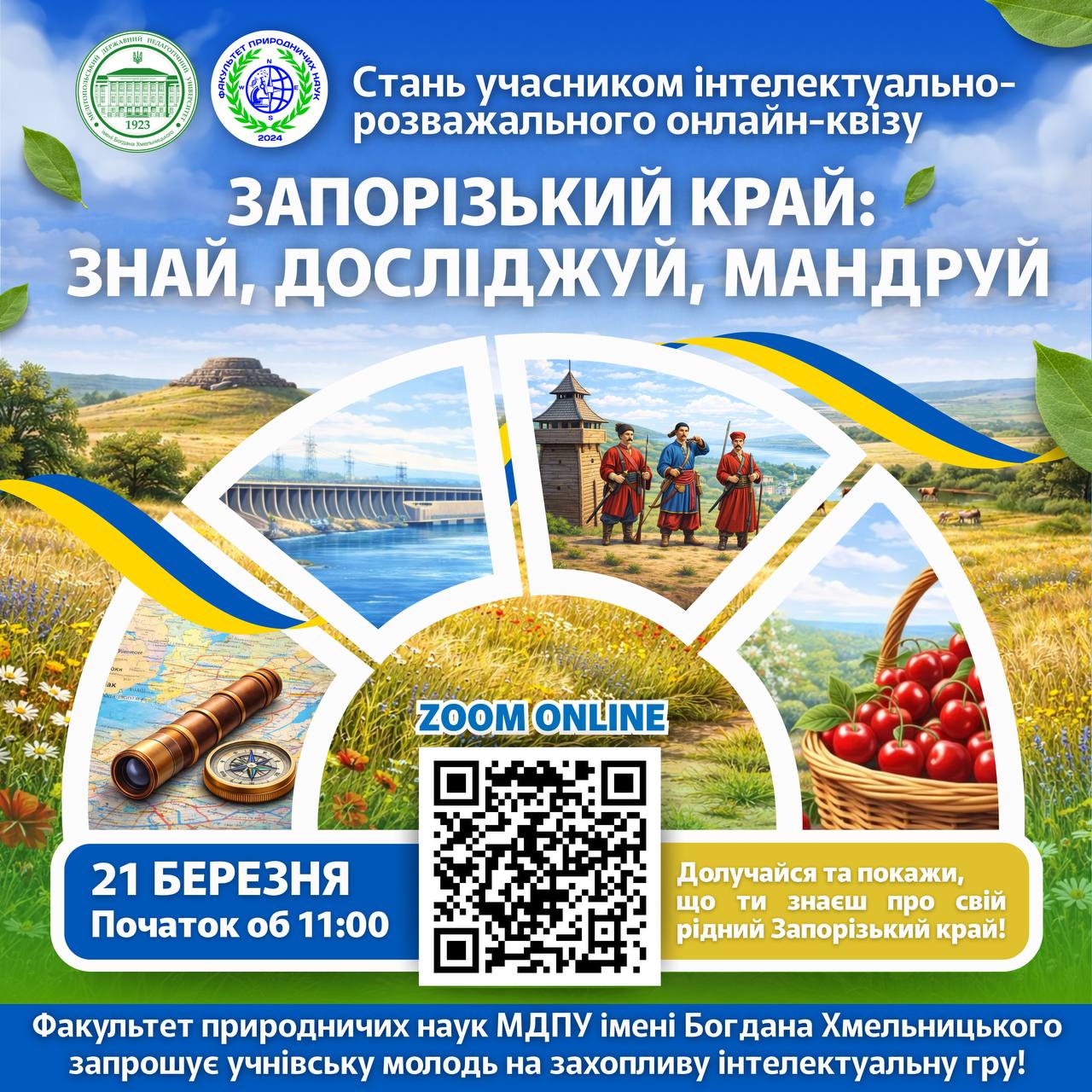 🎓🌱 Факультет природничих наук Мелітопольського державного педагогічного університету імені Богдана Хмельницького запрошує учнівську молодь долучитися до інтелектуально-розважального КВІЗУ «Запорізький край: знай, досліджуй, мандруй!»