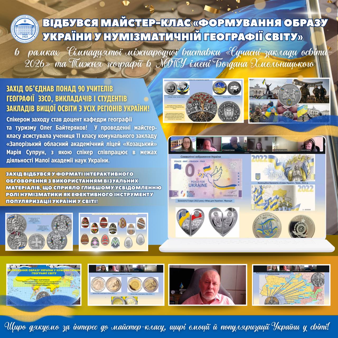 📅 26 березня 2026 року в рамках Сімнадцятої міжнародної виставки «Сучасні заклади освіти–2026» та Тижня географії у Мелітопольському державному педагогічному університеті імені Богдана Хмельницького доцентом кафедри географії та туризму Олегом Байтеряковим було проведено майстер-клас на тему: «Формування образу України у нумізматичній географії світу».