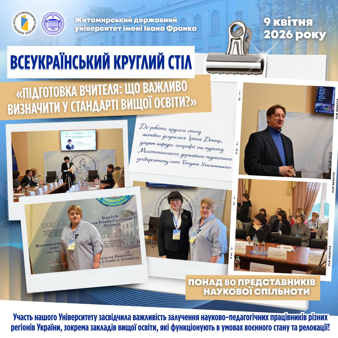 📅 9 квітня 2026 року на базі Житомирського державного університету імені Івана Франка відбувся всеукраїнський круглий стіл «Підготовка вчителя: що важливо визначити у стандарті вищої освіти?», організований за участі Національного агентства із забезпечення якості вищої освіти України.