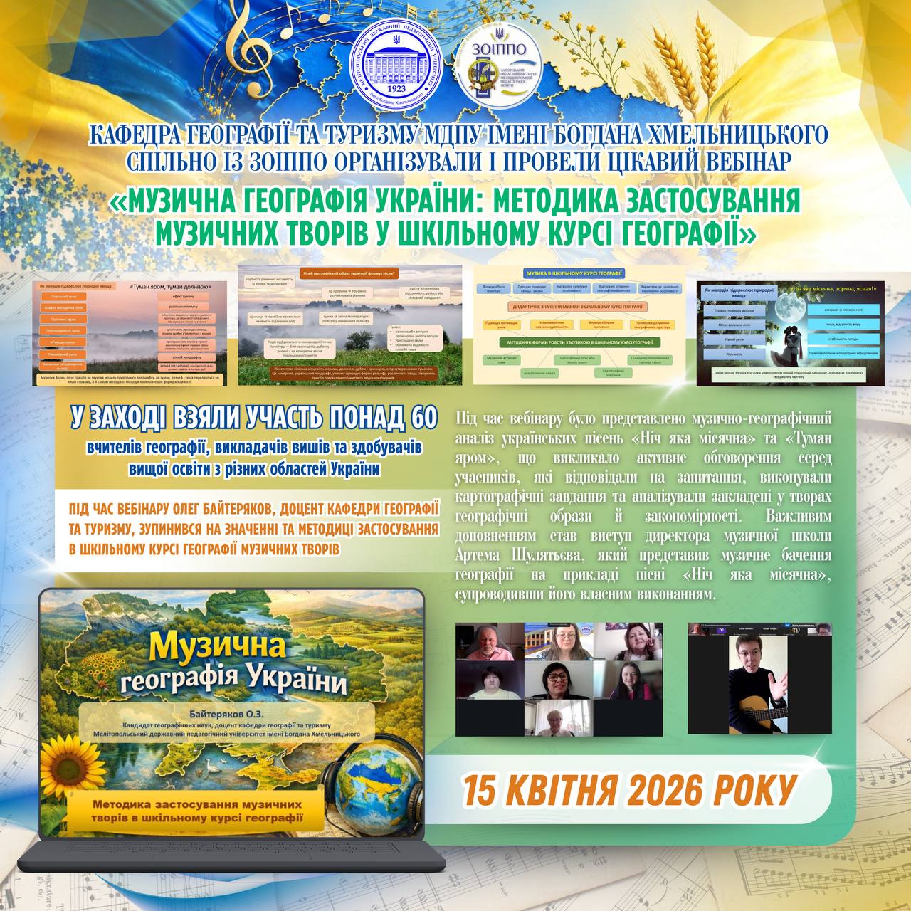 📅 15 квітня 2026 року доцентом кафедри географії та туризму Олегом Байтеряковим було проведено вебінар на тему: «Музична географія України: методика застосування музичних творів у шкільному курсі географії». Захід було організовано кафедрою географії та туризму Мелітопольського державного педагогічного університету імені Богдана Хмельницького спільно із Запорізьким обласним інститутом післядипломної педагогічної освіти. У вебінарі взяли участь понад 60 вчителів географії, викладачів вишів та студентів Запорізької, Донецької, Дніпропетровської, Херсонської, Одеської, Київської, Харківської, Чернігівської, Черкаської, Житомирської, Хмельницької, Тернопільської, Чернівецької, Львівської та Волинської областей.