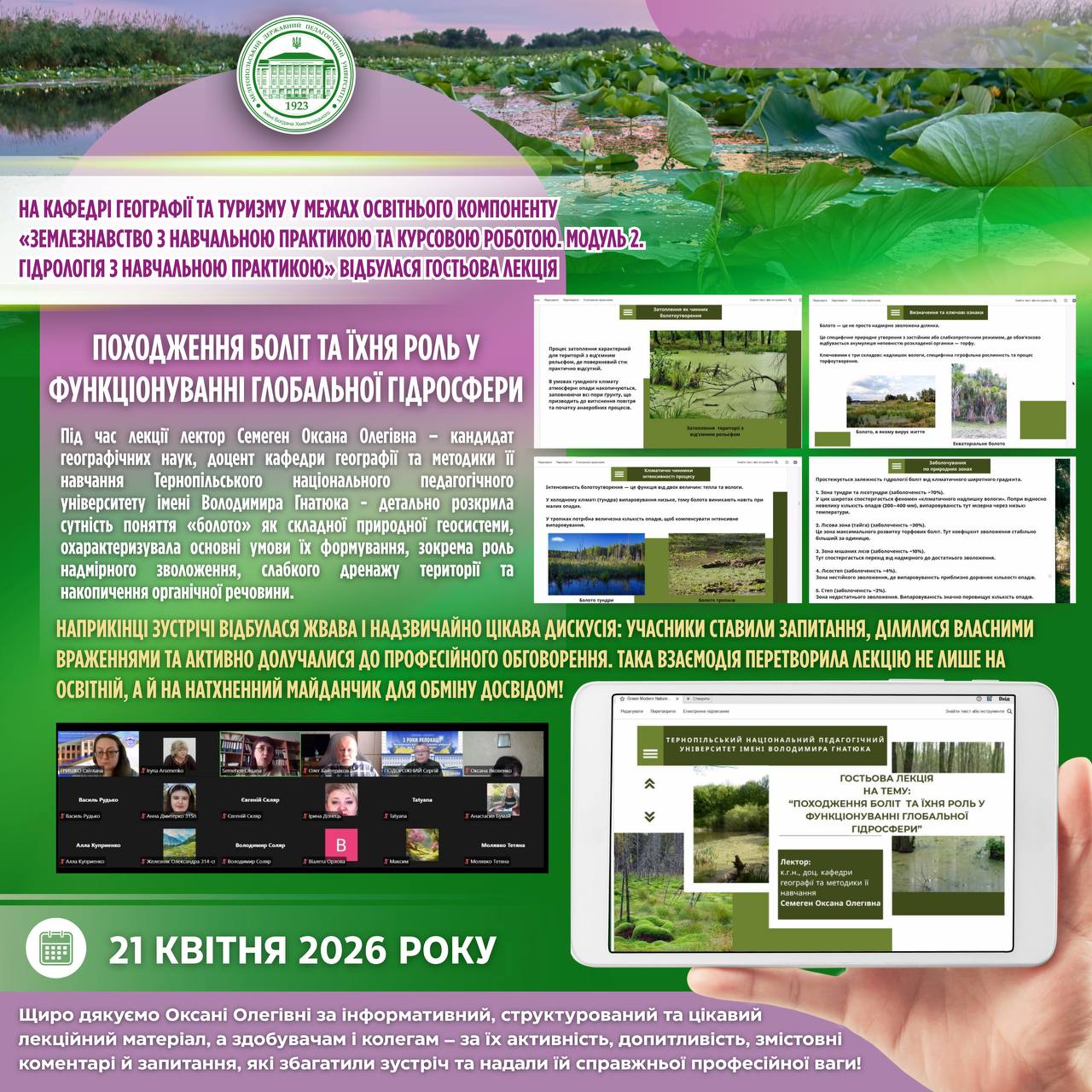 📅 21 квітня 2026 року на кафедрі географії та туризму Мелітопольського державного педагогічного університету імені Богдана Хмельницького у межах освітнього компоненту «Землезнавство з навчальною практикою та курсовою роботою. Модуль 2. Гідрологія з навчальною практикою» відбулася гостьова лекція Семеген Оксани Олегівни – кандидатки географічних наук, доцентки кафедри географії та методики її навчання Тернопільського національного педагогічного університету імені Володимира Гнатюка на тему: «Походження боліт та їхня роль у функціонуванні глобальної гідросфери».