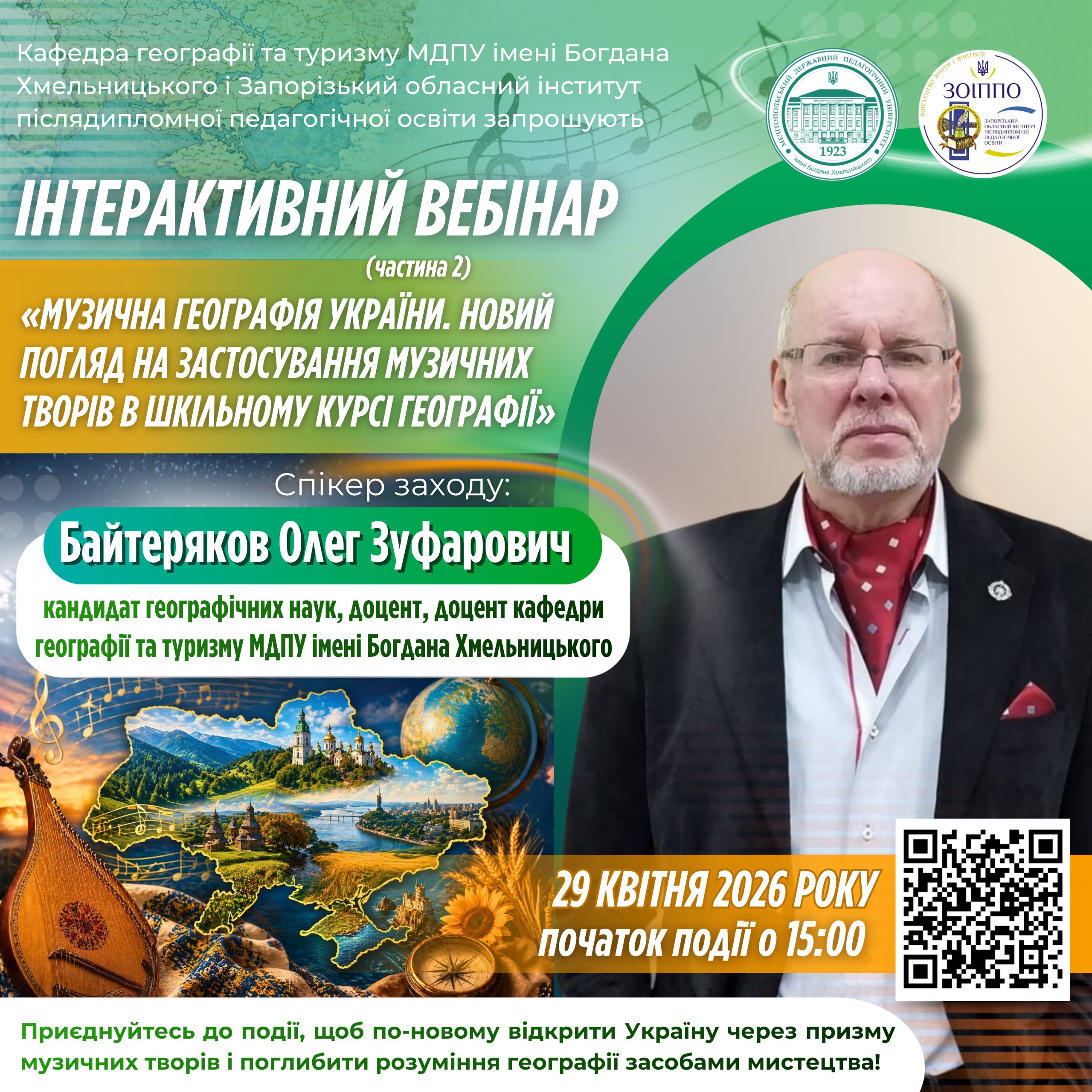 🏛🇺🇦 Кафедра географії та туризму Мелітопольського державного педагогічного університету імені Богдана Хмельницького спільно із Запорізьким обласним інститутом післядипломної педагогічної освіти запрошує стати учасником вебінару, присвяченого інтеграції музичного мистецтва у викладання географії.