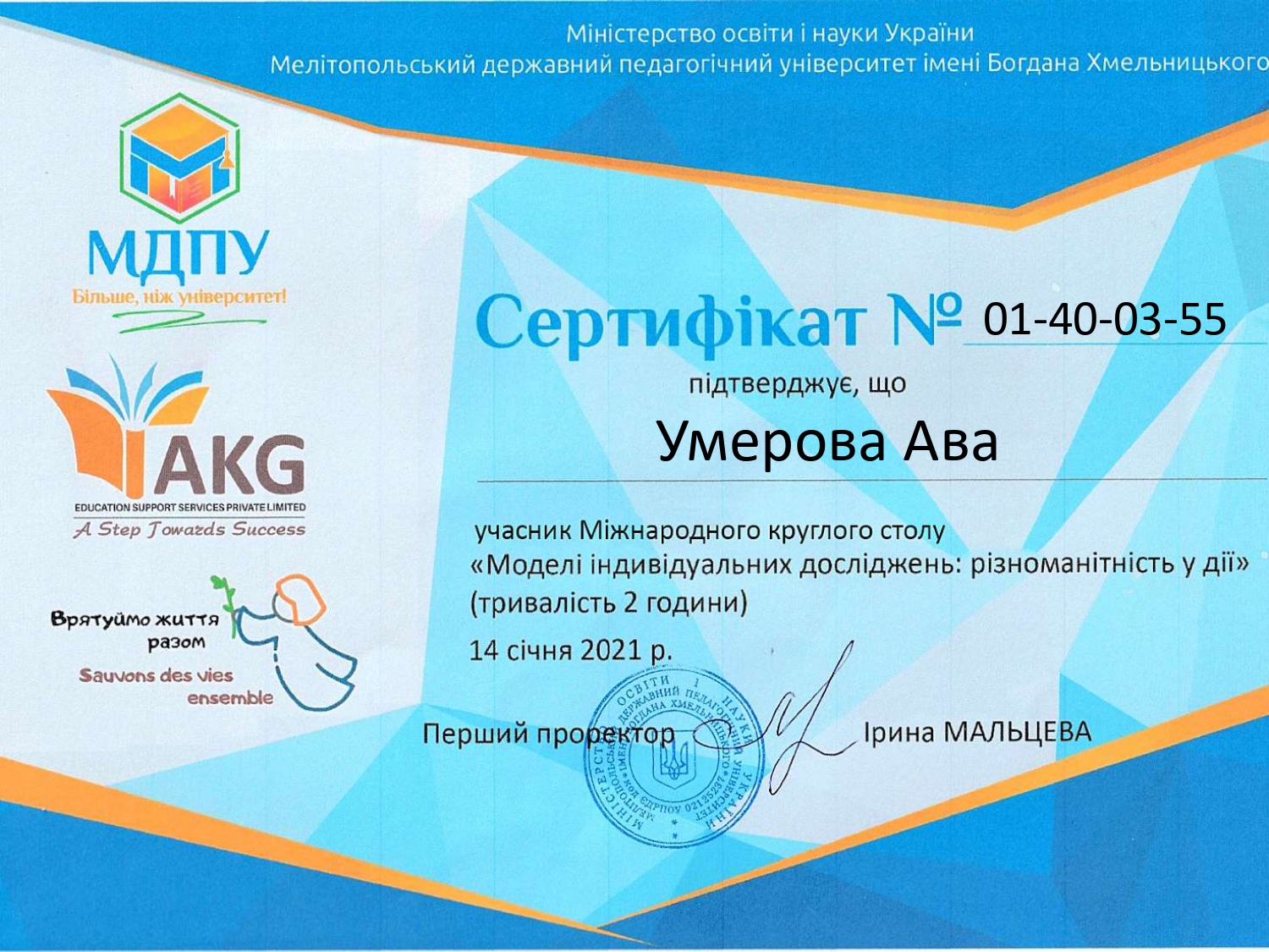 Стажування аспірантки Умерової Ави Кадріївни. Спеціальності 101«Екологія». Науковий керівник – д.б.н., професор Жуков Олександр Вікторович.