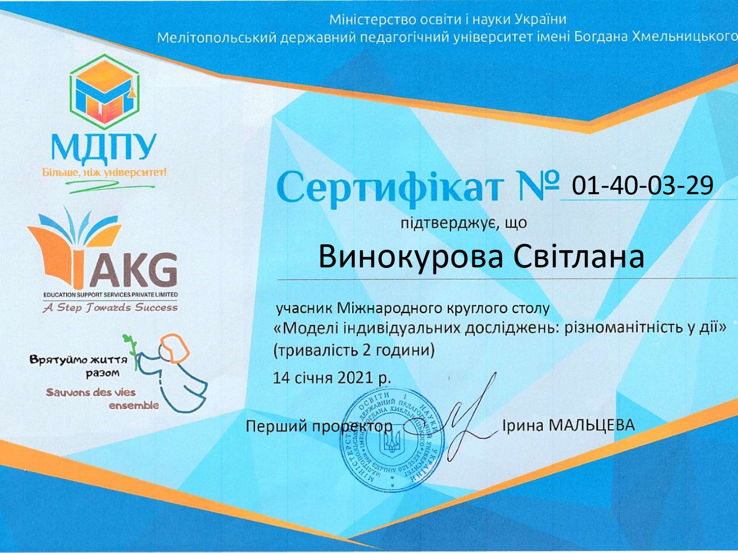 Участь аспірантки Винокурової Світлани Володимирівни в міжнародних наукових проектах. Спеціальність 101 “Екологія”. Науковий керівник – д.геогр.наук, доцент Воровка Володимир Петрович.